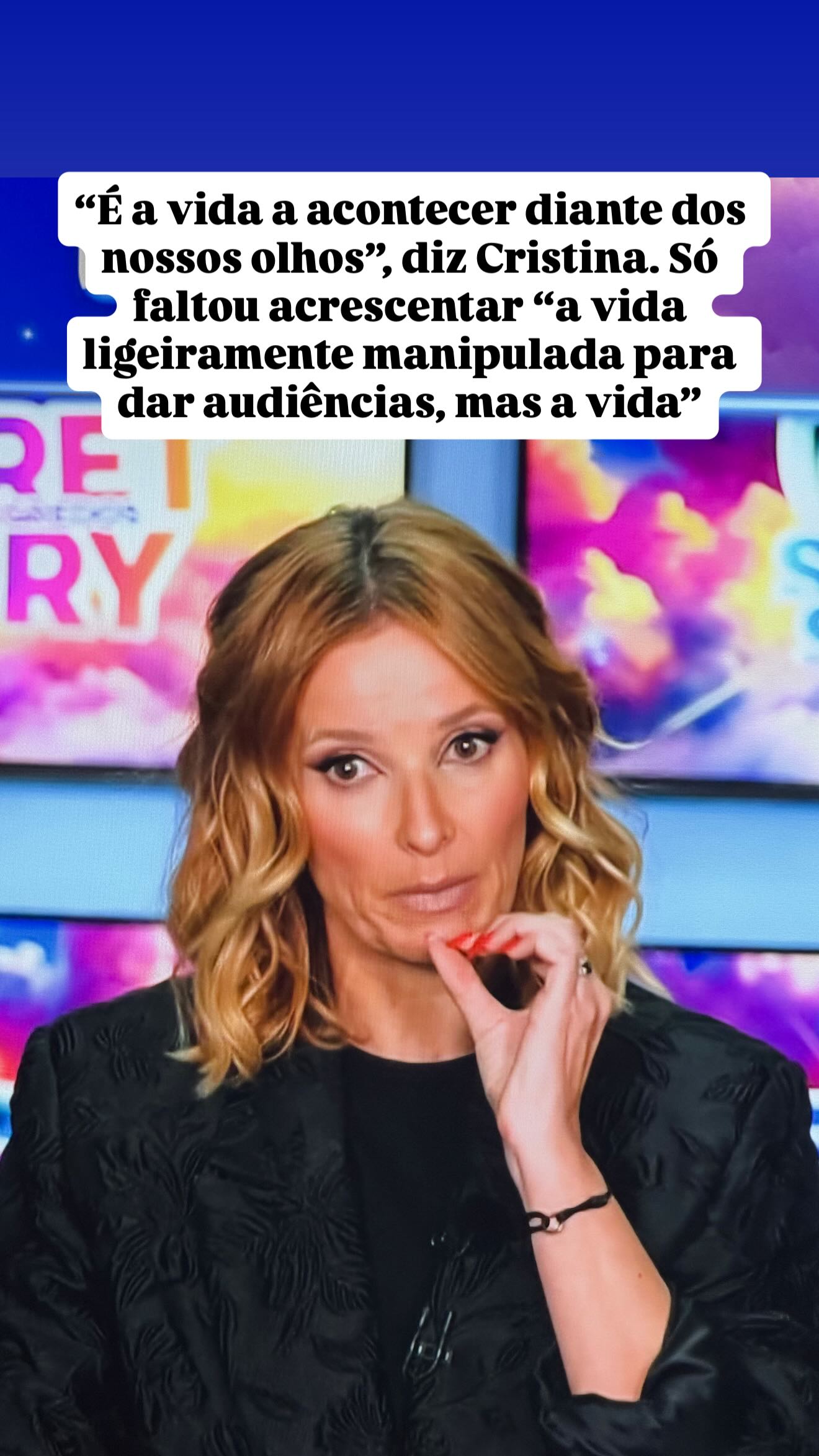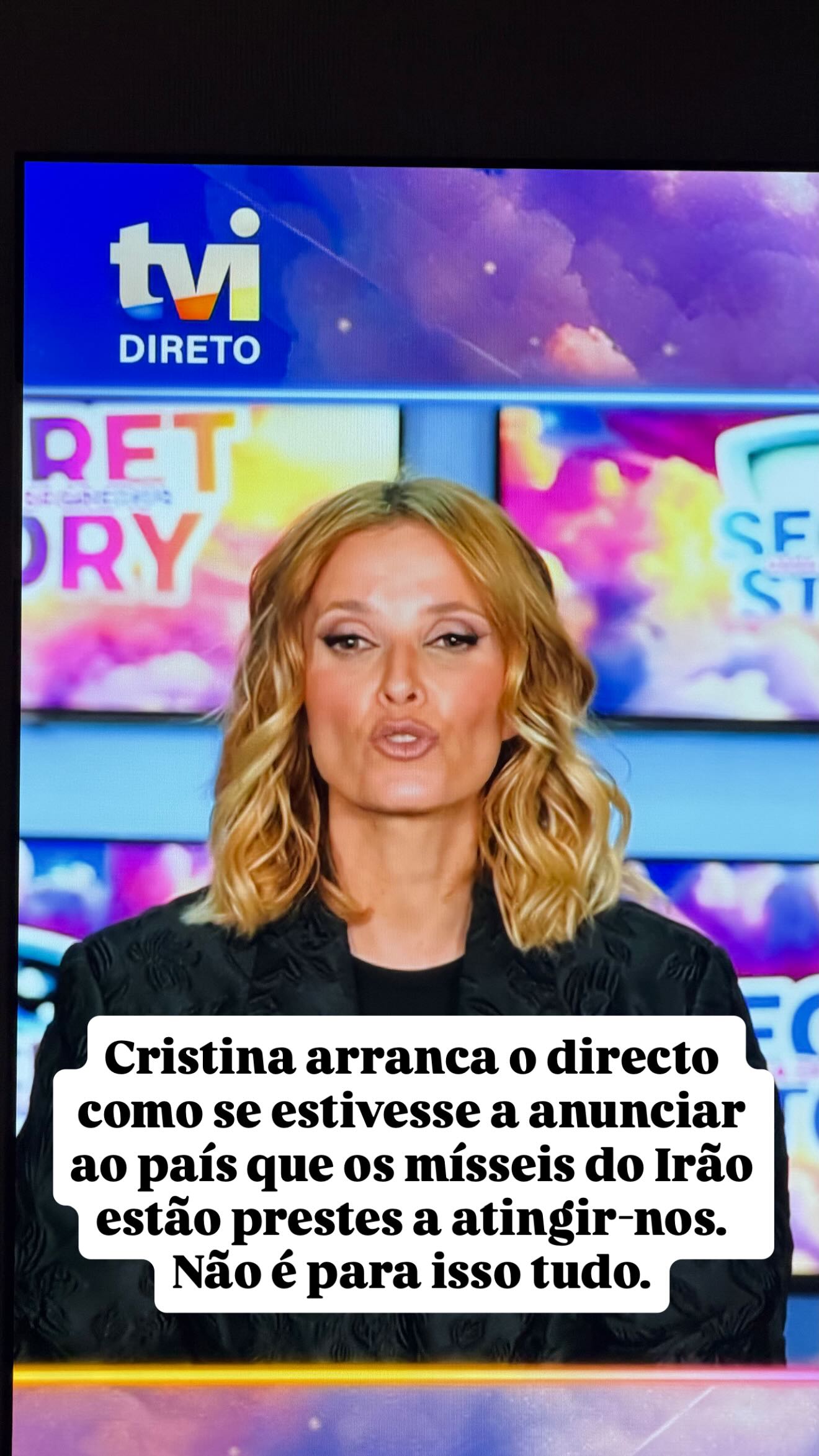 O alvo principal das críticas foi a condução do programa por parte de Cristina Ferreira. Numa primeira partilha, “A Pipoca Mais Doce” ironizou com o tom grave e dramático utilizado pela apresentadora logo no arranque do direto (quando a emissão foi travada para justificar o estado frágil de Eva no confessionário). “Cristina arranca o direto como se estivesse a anunciar ao País que os mísseis do Irão estão prestes a atingir-nos. Não é para isso tudo”, escreveu a antiga comentadora da TVI.