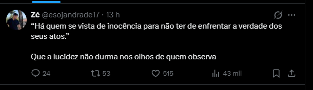 Zé Andrade dá assim a entender que a narrativa apresentada por Liliana é parcial e manipulada para a favorecer. “Há quem se vista de inocência para não ter de enfrentar a verdade dos seus atos”, escreveu, insinuando que a concorrente pode ter telhados de vidro que optou por não revelar aos colegas e ao público.
