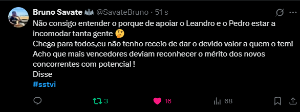 “Não consigo entender o porque de apoiar o Leandro e o Pedro estar a incomodar tanta gente. Chega para todos, eu não tenho receio de dar o devido valor a quem o tem! Acho que mais vencedores deviam reconhecer o mérito dos novos concorrentes com potencial”, disse.