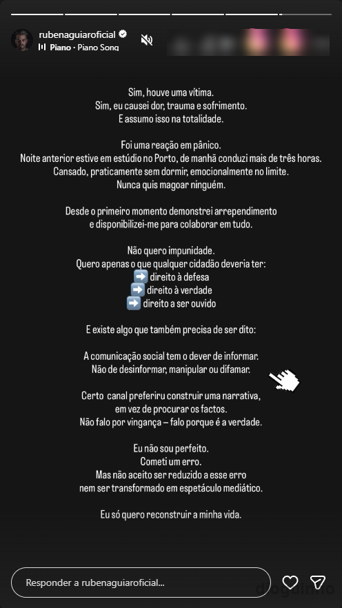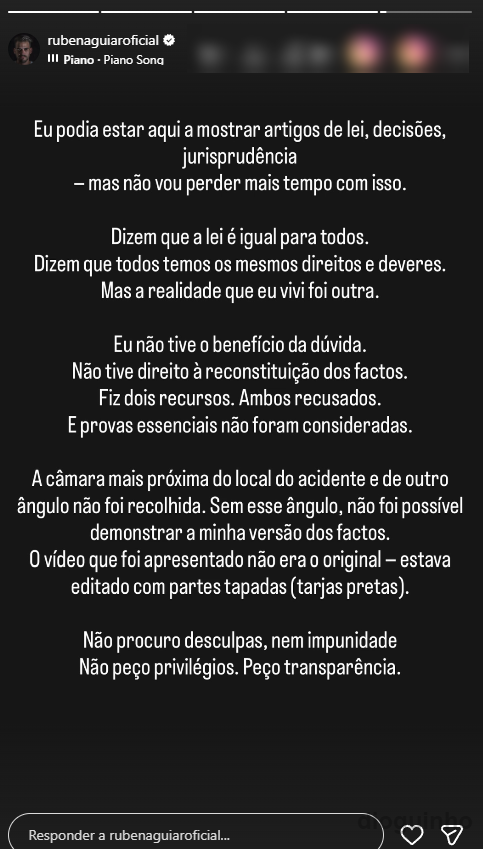 E continuou: “Eu não tive o benefício da dúvida. Não tive direito à reconstituição dos factos. Fiz dois recursos. Ambos recusados. E provas essenciais não foram consideradas. A câmara mais próxima do local do acidente, e de outro ângulo, não foi recolhida. Sem esse ângulo, não foi possível demonstrar a minha versão dos factos. O vídeo que foi apresentado não era o original, estava editado com partes tapadas. Não procuro desculpas, nem impunidade. Não peço privilégios. Peço transparência.”