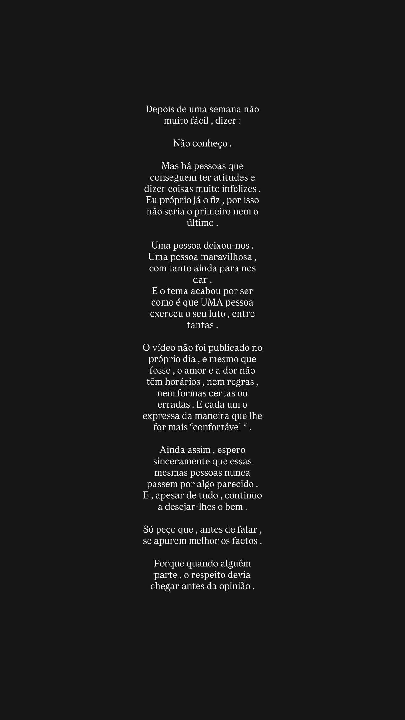 O jovem saiu ainda em defesa de quem partilhou vídeos ou homenagens nas redes sociais, respondendo diretamente às críticas sobre o timing dessas publicações: “O vídeo não foi publicado no próprio dia, e mesmo que fosse, o amor e a dor não têm horários, nem regras, nem formas certas ou erradas. E cada um o expressa da maneira que lhe for mais confortável”, defendeu.