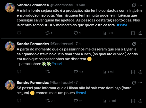 O ex-concorrente recorreu à rede social X (antigo Twitter) para garantir, com total convicção, que o destino de Liliana já está traçado: a concorrente permanecerá na casa, contrariando as sondagens que apontam para a sua saída, “Só passei para informar que a Liliana não irá sair este domingo, fonte segura, chorem mais um pouco”, escreveu Sandro, num comentário provocador.
