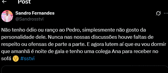 Nas stories deste sábado, 15 de novembro, Sandro foi direto ao assunto. “Não tenho ódio ou ranço ao Pedro, simplesmente não gosto da personalidade dele.” Mais à frente, frisou que, apesar das diferenças, sempre houve respeito mútuo. “Nunca nas nossas discussões houve faltas de respeito ou ofensas de parte a parte.”