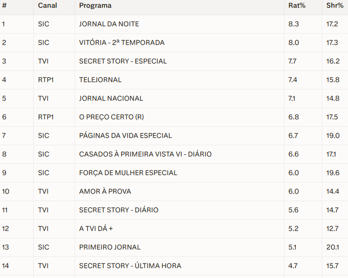Mas o revés para a estação de Queluz de Baixo não se ficou por aí. O Secret Story – Especial perdeu não só para o noticiário da concorrência, como também caiu perante a transmissão de Vitória – 2ª Temporada. A novela da SIC arrecadou a medalha de prata e o segundo lugar geral com 8.0% de rating e 17.3% de share, atirando o habitual líder da TVI para uma modesta terceira posição, com 7.7% de audiência média e um fraco share de 16.2%.