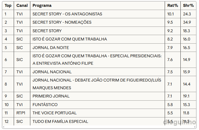 A TVI ainda colocou o “Jornal Nacional” no top 10, em sétimo lugar (7,5%), mostrando que também nos noticiários mantém o pulso firme. Já a RTP1 teve de se contentar com o 11.º posto, através do “The Voice Portugal” (5,5%), num sinal de que o serviço público continua a lutar para singrar aos domingos à noite.
