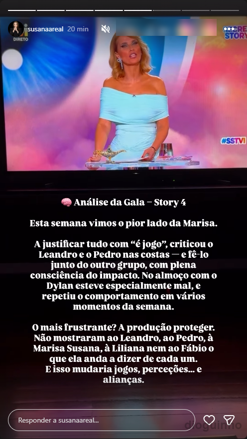 O episódio do almoço com Dylan é referido como um dos momentos menos felizes da semana, embora não o único. Susana lamenta ainda o que descreve como uma “proteção” da produção: os restantes concorrentes envolvidos não terão visto as imagens desses comentários. “Isso mudaria perceções e alianças”, sublinha.