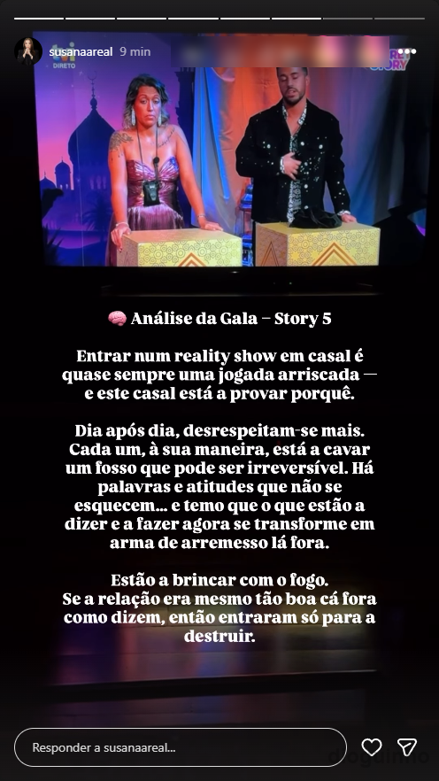 Marisa entrou no programa em casal e, para Susana Areal, essa opção está a revelar-se complicada. “Dia após dia, desrespeitam-se mais. Estão a cavar um fosso que pode ser irreversível”, alerta. A comentadora teme que as palavras trocadas dentro da casa venham a ter efeitos fora dela. “Estão a brincar com o fogo”, conclui.