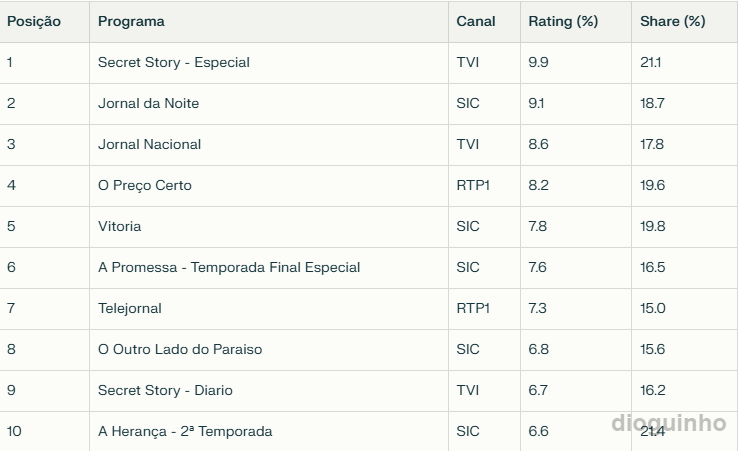 E a fechar o top 10, uma surpresa de peso: “A Herança – 2ª Temporada” (SIC) arrecadou uns expressivos 21,4%, provando que o público português adora um bom jogo de nervos e estratégia antes de desligar o televisor.