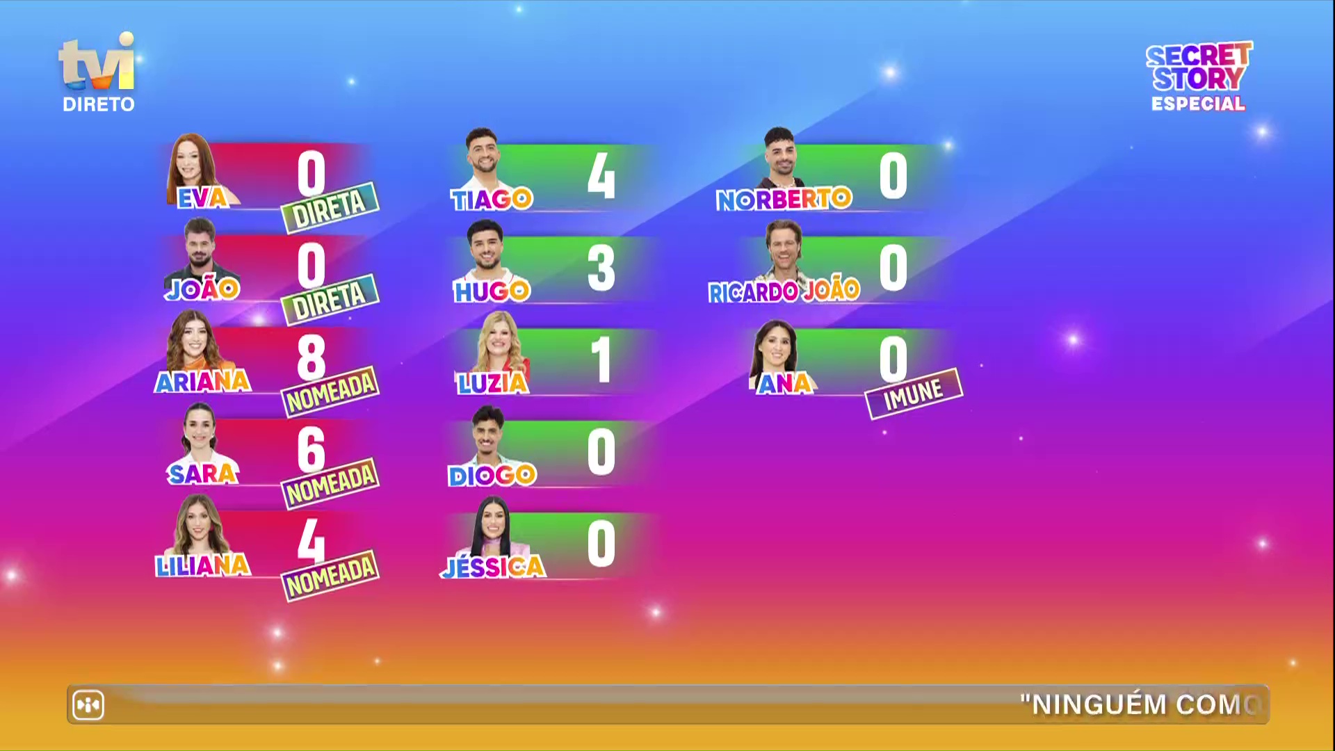 Afinal, quem votou em quem? Hugo optou por nomear Ariana e Liliana, enquanto Ana usou o seu poder de voto duplo para carregar em Sara. Jéssica seguiu a linha de Hugo e escolheu Liliana e Ariana. Já Tiago disparou em várias frentes, atribuindo um voto duplo a Sara e um voto normal a Ariana. A própria Sara não perdoou e devolveu a nomeação a Ariana, juntando Liliana ao seu leque de escolhas.