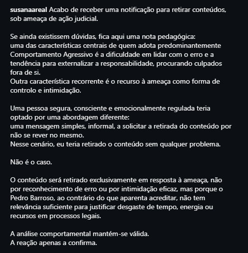 Num comunicado duro e direto, Susana Areal expôs a situação, revelando que foi notificada para apagar as publicações onde analisava o perfil de Pedro Barroso, sob pena de enfrentar as barras dos tribunais: “Acabo de receber uma notificação para retirar conteúdos, sob ameaça de ação judicial. Se ainda existissem dúvidas, fica aqui uma nota pedagógica: uma das características centrais de quem adota predominantemente Comportamento Agressivo é a dificuldade em lidar com o erro e a tendência para externalizar a responsabilidade, procurando culpados fora de si. Outra característica recorrente é o recurso à ameaça como forma de controlo e intimidação”, escreveu a profiler.