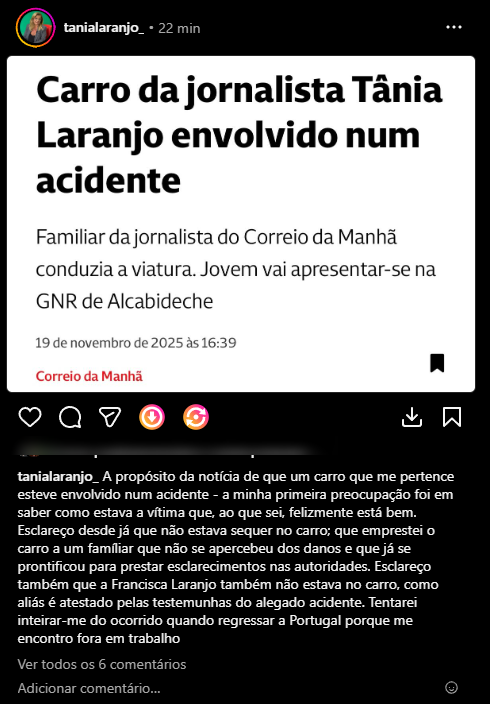 Tânia Laranjo esclarece acidente envolvendo o seu carro: “Esclareço também…”