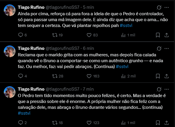 Ainda disse, “Para piorar, ainda reforça cá fora a ideia de que o Pedro é controlador, contribuindo para que a imagem dele saia manchada. E no meio disto tudo, diz que “acha” que o ama… nem sequer tem a certeza. Enfim. Que vá plantar repolhos, pá.”