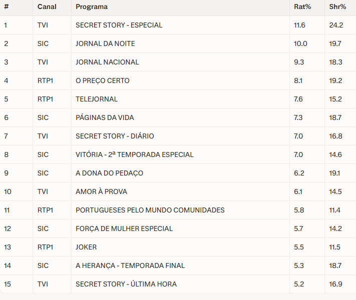 No departamento informativo, o cenário foi ligeiramente diferente, com a SIC a provar a sua força habitual e a continuar a dominar as opções dos portugueses. O “Jornal da Noite” assumiu-se como o único formato a fazer alguma frente ao fenómeno dos reality shows, garantindo um sólido segundo lugar na tabela com 10.0% de audiência média e quase 20% de share. A TVI manteve a perseguição, com o “Jornal Nacional” a colar-se à vice-liderança informativa com 9.3%, fechando assim o pódio geral do dia.