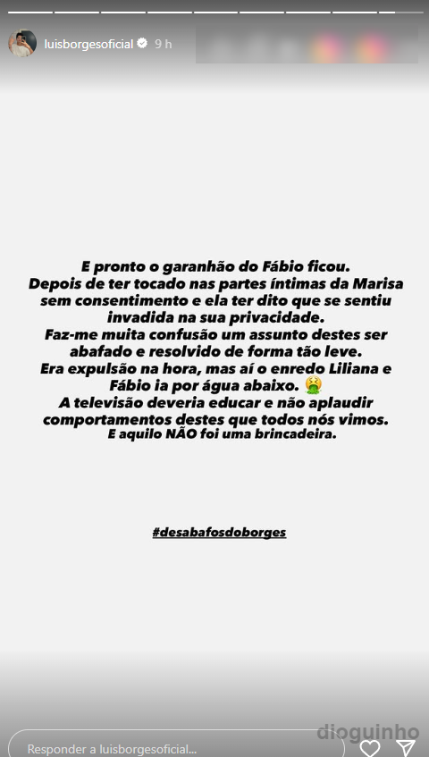 E lamentou, “E pronto o garanhão do Fábio ficou. Depois de ter tocado nas partes íntimas da Marisa sem consentimento e ela ter dito que se sentiu invadida na sua privacidade.”