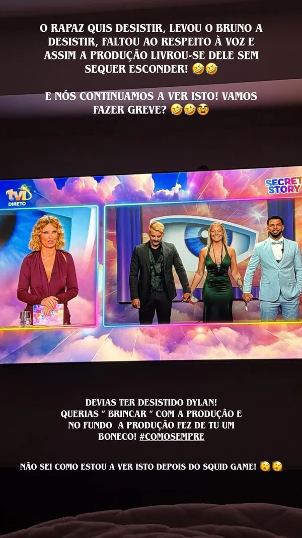 Logo a seguir, deixou um recado direto ao ex-concorrente, “Devias ter desistido, Dylan. Querias brincar com a produção e, no fundo, a produção fez de ti um boneco, como sempre”.