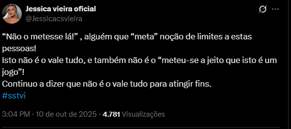 Quem não gostou de ver a reação do Dylan, foi a Jessica Vieira, a vencedora do BB Verão, “Não o metesse lá!” , alguém que “meta” noção de limites a estas pessoas! Isto não é o vale tudo, e também não é o “meteu-se a jeito que isto é um jogo”! Continuo a dizer que não é o vale tudo para atingir fins.”