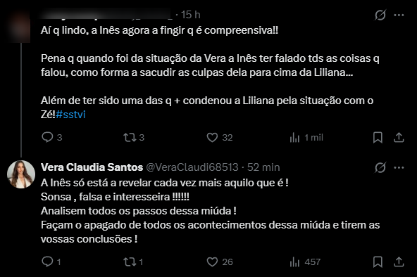 Tudo começou quando um fã do SS9 acusou Inês de hipocrisia, relembrando atitudes passadas. “Ai que lindo, a Inês agora a fingir que é compreensiva! Pena que quando foi da situação da Vera, a Inês ter falado todas as coisas que falou, como forma a sacudir as culpas dela para cima da Liliana… Além de ter sido uma das que mais condenou a Liliana pela situação com o Zé!”, escreveu o internauta, expondo o que considera ser uma incoerência na postura da concorrente.