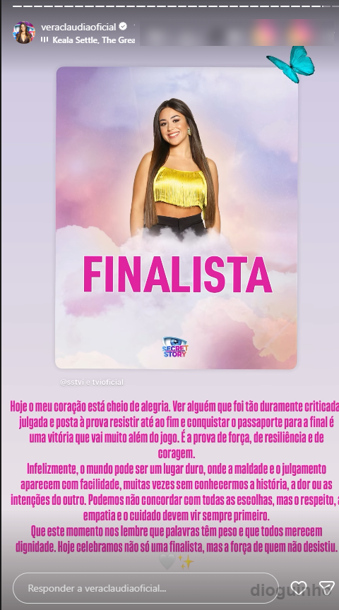 Na sua conta de Instagram, a assistente dentária partilhou um texto emotivo onde destacou a capacidade de superação da finalista, que sobreviveu a semanas de intensa pressão: “Hoje o meu coração está cheio de alegria”, começou por escrever a ex-concorrente, sublinhando o percurso difícil da colega dentro da casa mais vigiada do país. Para Vera, ver “alguém que foi tão duramente criticada, julgada e posta à prova resistir até ao fim” e conseguir o objetivo máximo “é uma vitória que vai muito além do jogo”.